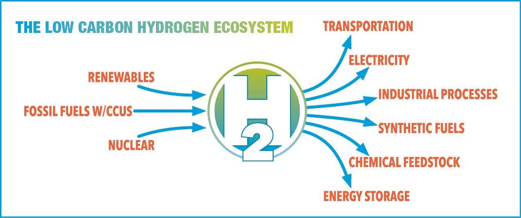 Low carbon hydrogen (LCH) can be used to store, move, and deliver low-carbon energy to where it is needed. It can be transported as a gas by pipelines or in liquid form by ships, much like liquefied natural gas (LNG). It can be stored as a liquid, gas, or chemical compound such as ammonia.